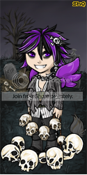 Average build, pale skinned. Eyes are purple and outlined in kohl.