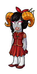 In Their Own Words: Damara Megido from Homestuck. Damara is a Beforus troll, an type of alien very different from humans. Their blood hues mirror the rainbow, with maroon as the lowest color and fuschia on the top- this is known as the hemospectrum. A troll's blood color determines how high in society they rank- since Damara is a rust blood, she is at the very bottom. Damara played a game called SGRUB which led her to gain godly powers over time and time travel. Her title is the Witch of Time. She was betrayed very badly, and lost faith in others. She became callous, perverted, and rude, and does not respect others' boundaries. She speaks her mind, and is rooting for the side of Evil. Damara represents some parts of the astrological sign Aries- the Ram.