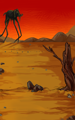 Yeugen is an artist fascinated with water and light. Lack Of is a painting dealing with the effects of the lack of water: from rising temperature to the onset of hallucinations. Yeugen is said to have seen the creature in this painting in a thirst-induced dream.