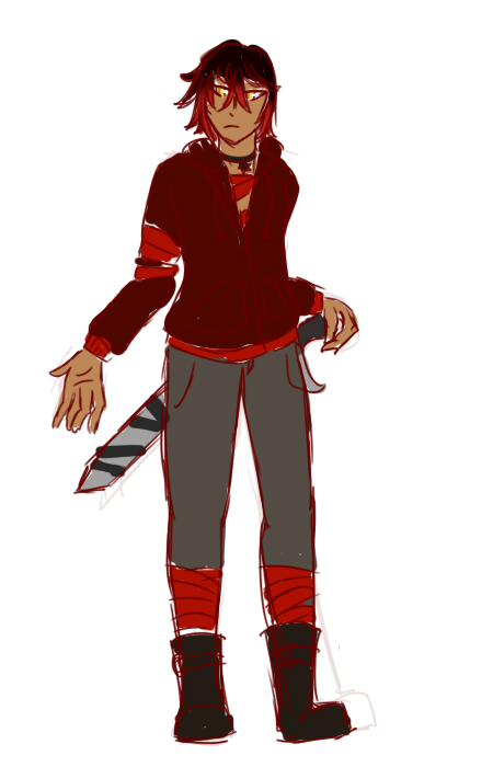 Clothing: Black jacket, red ribbons wrapped around his torso beneath. Black trousers, large boots