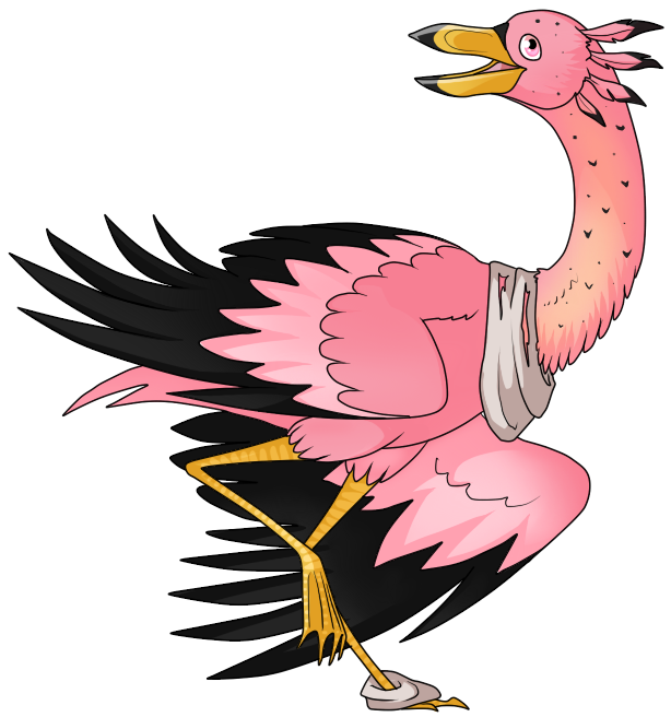 I'm so happy I have him now. *Squeezes*I'm going to be Nostalgic come January. ^^ I want his profile to be epic. Brainstorming ideas...This self-absorbed bird loves himself and anything else of the avian variety. CamoRon's was born in the city of "Feathertor", a long forgotten but ancient and advanced city in the country of South America. The citizens worshiped birds and many of their deities took on the shape of birds. CamoRon was once a human, a low ranking warrior in a squadron specializing in camouflage. In his clumsiness, he accidentally became cursed by a bird deity to grow large and forever take on the form of his spirit animal: an extinct species of pink stork his people nicknamed "flaminging". Seeing this a great blessing, his people gave him the important role of the "king of birds" and protector of his people, a job that CamoRon took very seriously. Unfortunately, although his new form was formidable, being a 25 feet tall pink bird did not complainant his warrior training in camouflage and he was a ineffective protector to anything opposition beyond mortal force, like certain demons. It wasn't long before Featherthor came under attack by a the reptilian demon Xiquso. CamoRon, though fighting valiantly, failed to defend his kingdom and instead transported the survivors high up in the mountains were only those with wings could fly in and out. Camo brought food and supplies to them regularly so they never had to hunt or pillage other cities. They lost freedom exchange for pace, and many were still grateful to CamoRon. What Camo, couldn't do however was protect his people from disease and infertility, which eventually became the doom of his people. Still immortal and now alone, CamoRon is the last remaining remnant of his kingdom and their traditions. As a result, he is quick to keep his old ways and believes birds are the most supreme beings. He has also become a tad delusional over the years as a recluse as well, believing the birds themselves are his people, learning the language of the fawna. He no longer remembers his human origin-even forgetting his birth name-but he continues to wear some sort of white cloth on his leg and neck as clothing, somehow feeling "naked" without them. He would live up in the mountains alone with other birds, until a certain friend finds him and convinces him to travel with her. Together, they meet creatures of magical origin with similar circumstances as their own: the last of their kind, displaced, and often immortal, and become an adoptive family-for better or worse. ---------Other Facts about him:*The name "CamoRon Trail" was a name Camo would later call himself as he spent time with his family. His first name is a combination one of his favorite English words "Camouflage" which meant to be visually deceptive and his favorite Western name "Ronald" meaning ruler and powerful. The last name "Trail" is the word he and his family chosen to be the surname of his adoptive family. Sometimes, Camo he even gives himself the middle name "Flaminging".*Due to his has an extreme dislike of reptiles of all kinds, developed after Xiquso's attack on Featherthor. He is very quick to judge them and instantly hates any reptile he meets. Though his attitude become a lot better has he spends time with the Trail family.*^This is especially true with dragons dragons-which burned off the headfeathers on the left side of his head.*^This dragon would also later be his adoptive sister, Amperditace Trail. *Despite being as old as he is, CamoRon still has the energy and youthful spirit he had when he was changed into a bird, which may mean he also has eternal youth...but as a bird. *Ironically, despite his long built dislike of reptiles, most of the family members on the Trail family are reptiles including one dragon, three wyns, and a certain reptile demon.