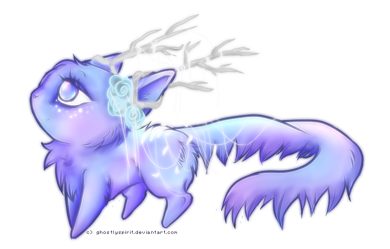 Spindles and sinews casually weave with intricate form as if poured from the colors of ethereal makings of Luna's grace. A daunting ghost or luminous dreamland colors dress the naked canvas of the alien creature. Colors of an evening approach in silver blues and soft, plush lilacs paint in a tye-dye mesh. Silvery-white speckles fleck beneath soothing celestial eyes. In the shape of canine form; white, glowing branch-like antlers grow from eye level and snake carelessly around slender ears before spindling off as both protection and decorative noise. Silkworm threads grow and hand loosely in web-like formation, often confused as spiderwebs until touch breaks through the sensory to prove silk-worm work. These strands web through her antlers and then dress throughout her lithe, enviously slender bodice. These antlers disappear in her elven form, long hair matching the pastels of her coat. Silver-white blue roses grow just at the base of her right ear. Kindred petals hang loosely from silkworm strands and various places along her body with floral décor. Only in her canine shift do ethereal white stripes paint in a number of four in total ranging from largest to smallest down her dorsal before ending at the start of her abnormally long tail draping with exquisite, alluring gesture from behind.
