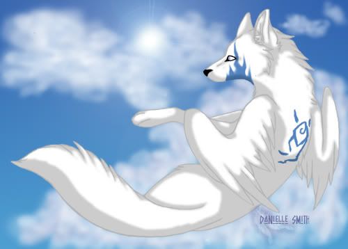 Pale violet eyes stare through the endless time of clouds. Wings ruffling at the slightest sound, tail swaying in an annoyed way. Gaze turned to meet viewer, expression none like an angel's. Her eyes show the coldness that her heart consumes. Her voice lost through the times.