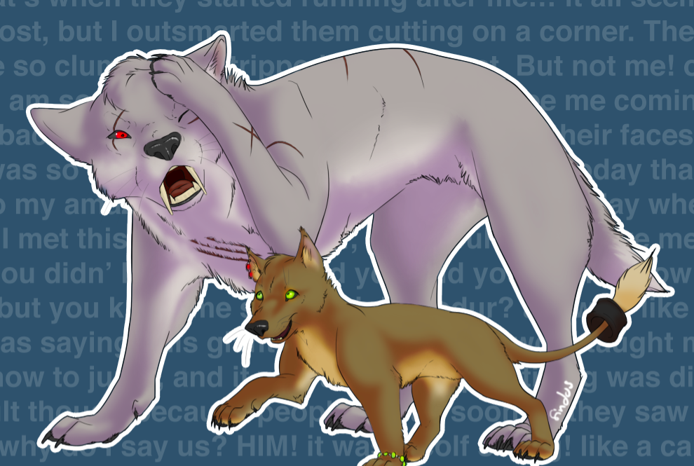 But they came again, humans and pets, trying to kill him, because he lay on the ground unable to move. Not fair, but life isn�t fair. But SHE had something against it, running forward, biting and scratching her enemies. Nearly got killed before his eyes, so he had no other choice besides to stand up and jump, landing before her and letting out a voice he never heard himself making before. The growling heard was not angry, not fearful, not sad. Only a growling you never would forget, making you run without thinking, wishing for forgiveness.