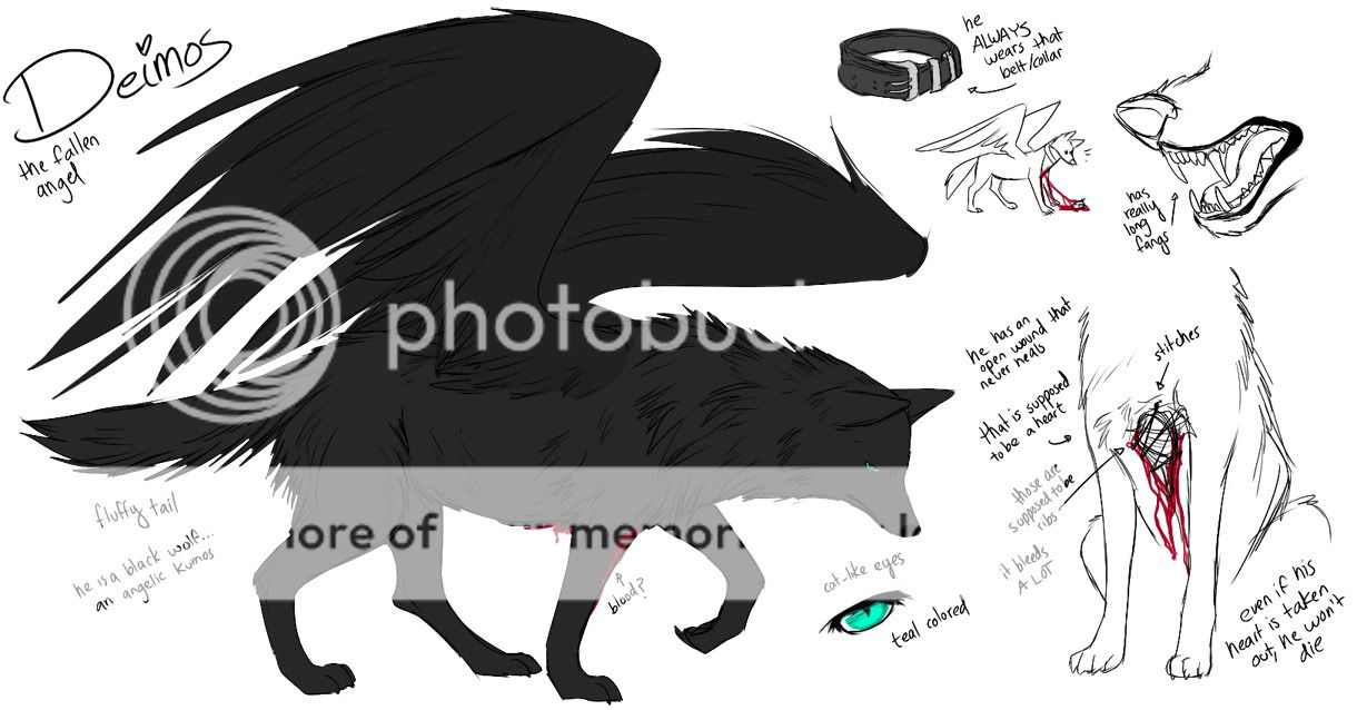 In human form, Deimos has black hair, which lengthens as the story progresses, and cat-like teal eyes. He has fair skin and is rather tall. He is considered quite handsome by many, girls and guys alike. Deimos can sprout black-feathered wings from his back at will. He has a thing for leather pants, jackets and belts, and rarely takes off his belt collar.
