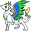 Looks: She has a yellow blank around her forehead. She has blue and yellow markings all over her legs, a yellow and blue wave heart is said to be be seen on her right back leg. She has yellow and green bangles around her right front ankle and she has them on the tip of her ears as well. Aroreia has snow white fur. Her wings are grey, blue, green and yellow. She has One blue moon on her right eye and the other yellow. Her tail is white and at the tip a green bangle with yellow fur and blue "Never Melt" Ice teeth. Her Eyes Are light grey but sometimes turn dark grey when shes mad.