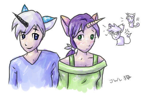 Quad: Eobelle has long purple hair, tied up in a ponytail by a white strip of cloth, as opposed to the normal demi mane. She has markings on each leg that reach her 'knees', they are similar to what would happen if you stuck her in paint. These markings also appear on her tail and on her ears, and she has the normal dawn demi markings around her eyes and down her back. She has a shell necklace around her neck, and a feather earring which is white, purple and pink in one ear.Anthro: (Including everything Quad =3) She wears a green shirt with a fairly unexplainable design (-pokes ref-) at least to KSM, the fashio noob, revealing a part of her stomache. On her legs are a pair of jeans, with embroidered hearts of various colors at the bottom. Eobelle is fifteen, tall and skinny, yet apparently not attractive enough to lure the only guy she wants.