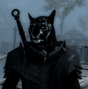 A merchant / mercenary in Skyrim. Often to be found in Riften nowadays.He is a broad shouldered Khajit with dark, near black, fur and white silvery striped markings.