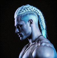 Hair:blonde almost white- long and straight, choppy and layered, bangs are short