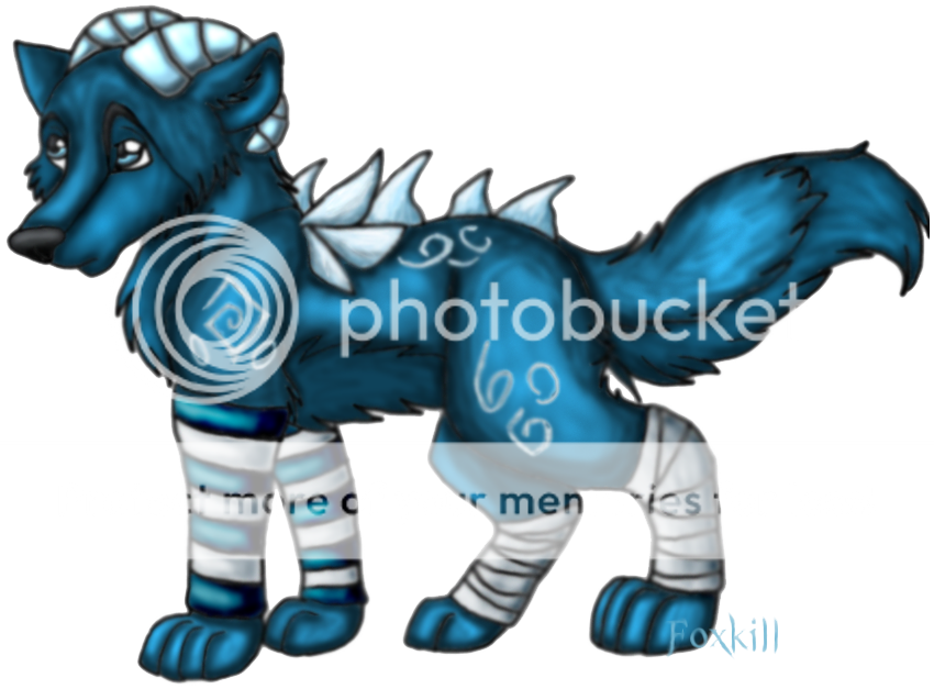 You can barely make it out but you can see the dark blue pelt that the creature bares. His body is decorated with white tribal designs and icy bone protrustions aligning his backbone. Atop his large cranium are two wickedly curved horns, their exterior glistening in the available light as it turns its head toward the small Rikag at its feet. Blue and white armwarmers cover his front legs as bandages are seen wrapped around his hind legs.