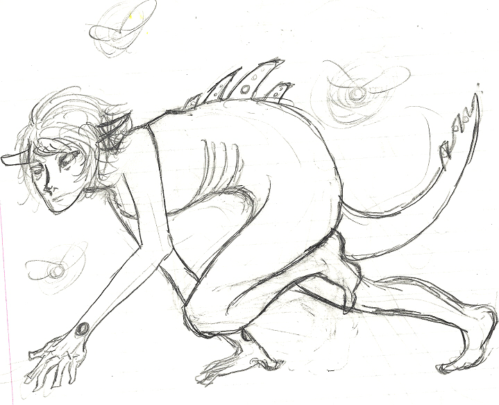 Golithe. A name very similar to Goliathe, a giant mentioned in the Bible. However, Golithe is far from a giant. He is a what many call a Common Experiment, number eighty-four to be exact. His age is unknown, his lineage is unknown, his family is unknown. Golithe is what one could call a mystery, something that is difficult or impossible to understand or explain. He is not very tall, nor is he very muscular. He has a lean body, you could call it a swimmer's body, but he is definitely not built for hard labors. His hair, which still mystifies many, is a rich golden colour, a colour one might associate with an apricot or a peach. It is such a mystifying hair colour only because he has a deep purple-gray skin tone and dark eyes, eyes that are actually mostly black with little white pupils. Golithe's most significant feature, however, are the large holes in his wrists, tail, and even in the spines on his back. A bone malformation, some claim.Golithe was believe to be born, more so created, in a scientist’s laboratory that exists on the very edges of society, and the very edges of reality. Rumors about said laboratory range from one end of the spectrum to the other. Some stories are very kind and describe the laboratory as a hospitable place, however other stories depict the worst cruelties a man can inflict upon a being. The laboratory is simply called the Laboratórium due to the heritage of the scientists that work there. Many say they are of Latin decent, but others claim they are strictly Hungarian. Even with all the rumors about the Laboratórium, not a single soul can name any of those who work there.
