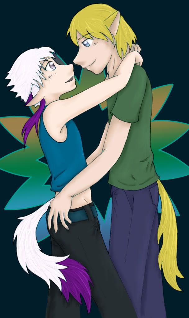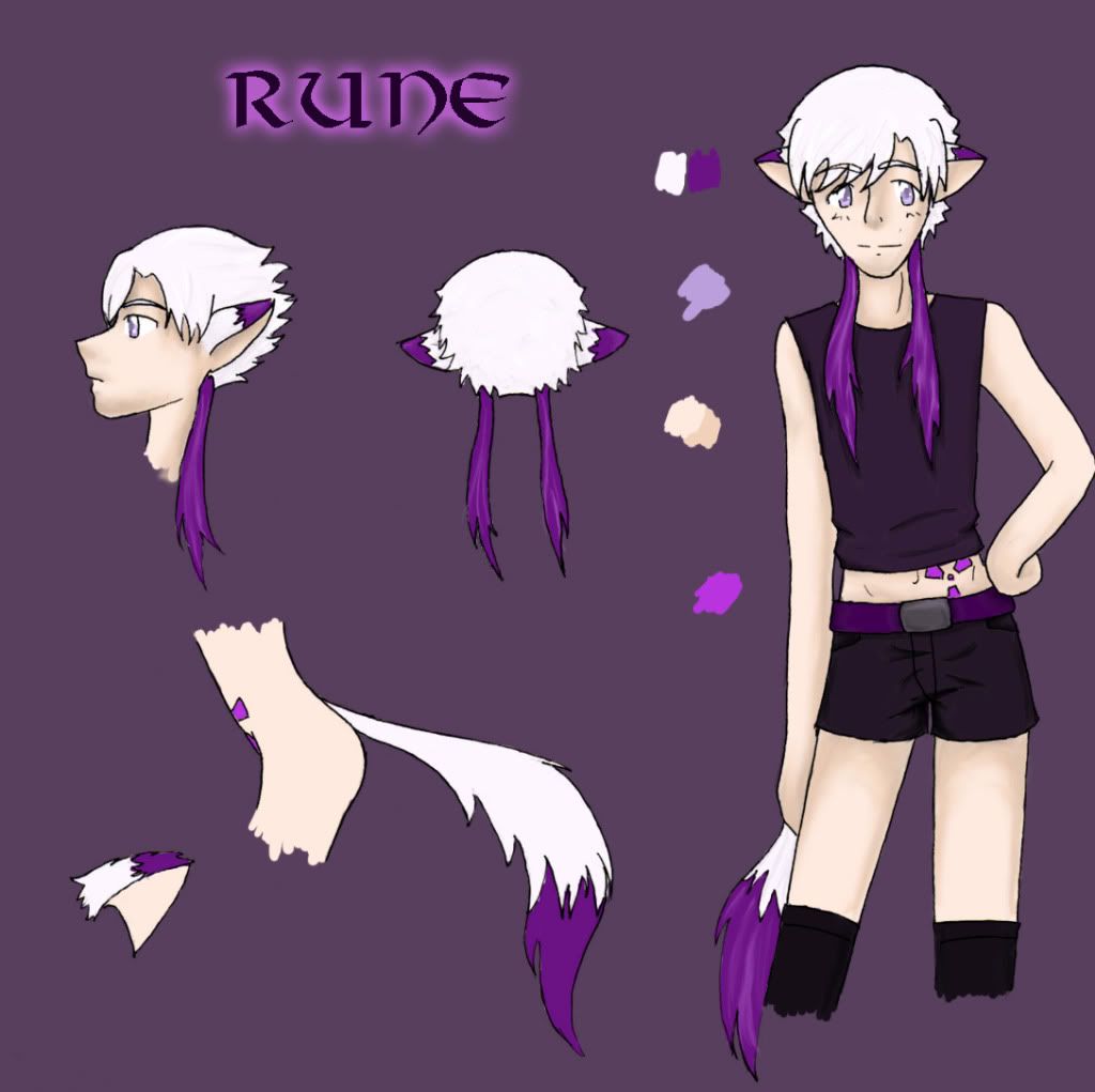 Appearance: Rune wears most of his white hair cut short, bangs fall over his face and the back is usually spiked up. Behind each of his ears he has a lock of longer hair that is dyed bright purple. He much prefers his winter coloring, so when it starts to change in the spring he starts dying it to keep the locks as light as possible. His ears and tail are the same, white with the tips dyed bright purple. His eyes are a pale lavender-blue.