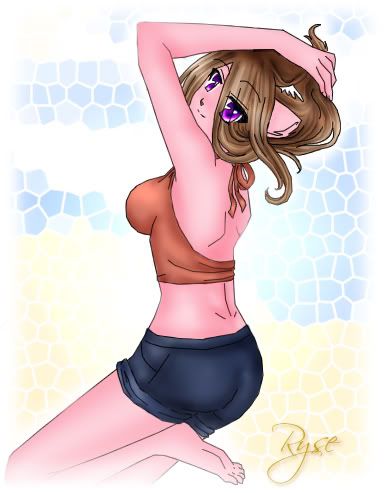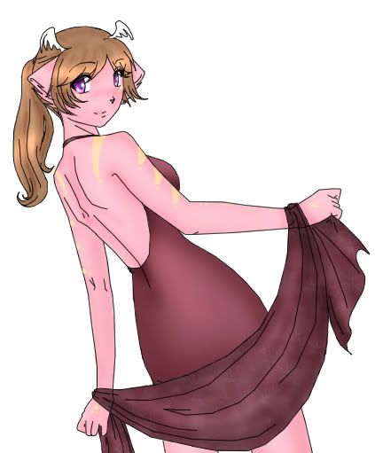 Appearance: Somewhat petite and with a lean build. Skin/fur is light pink in colour baring many yellow markings. Large violet eyes rimmed with dark lashes long, slightly wavy light brown hair. Generally wears dresses or skirts- dislikes pants. Sports a halter top and shorts in hotter weather.