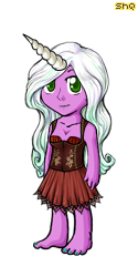 Skin tone: Purple with darker indigo freckles on her arms