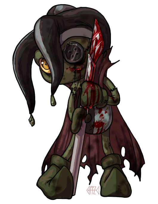 The lovely voice beckoned him further. Slowly, stiffly, he approached the patch of moonlight. There in it's blue-white pool lay a very strange looking plush. It was moldered and mildewed from age and the elements. Faded shades of greens and blues glowing eerily in the moon's light. Rips and pulled seams ran here and there in the fabric. It was rather large. Maybe two and a half feet. Maybe more. It was hard to tell from the angle the toy was lying and the large jester type hat upon his head.