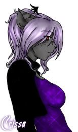 Appearance: Somewhat tall for a female and rather slender. Skin/fur is a darker grey with black markings located (most notably) on her ears, tail, under her eyes, on her sides, and down her arms. Plum coloured hair is usually up, and she is usually dressed for the club or some other social outing. Right eye is ruby red, left is emerald green.