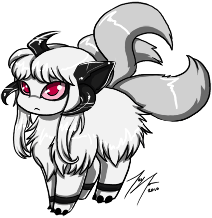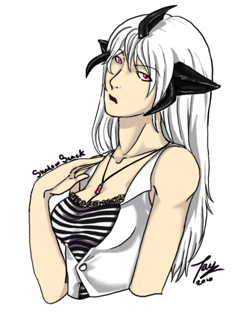 Distinguishing Features: Three black horns protrude from underneath her hair. Has three long fluffy white tails. He nails are naturally pointed and black.