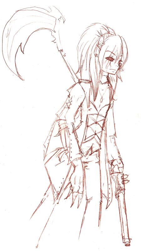 Common Attire: Lei's attire consists of a small dull and off white blouse that is covered by a waist cincher/corset. He wears see-through silk pants and often times wears Sandles over anything else. Aviator gloves are used for his one good hand while his other is left along as nothing can really cover the... malformed limb. He is almost always carrying a gun with him and his Scythe... it's rare the Lei is seen without his weapons of choice.