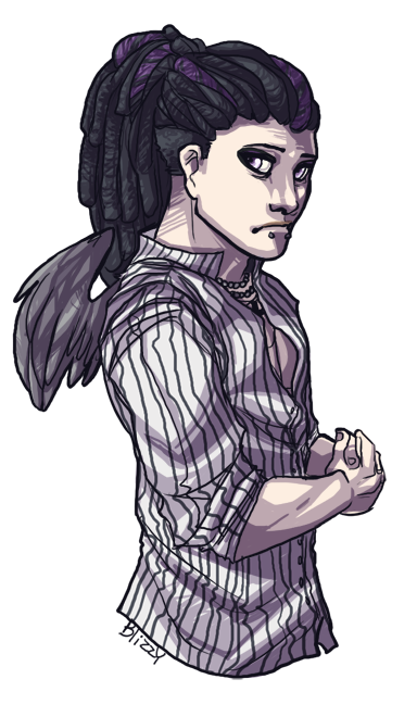 Hair: Long, thick black dreads usually in a ponytail, shaved from behind the ears