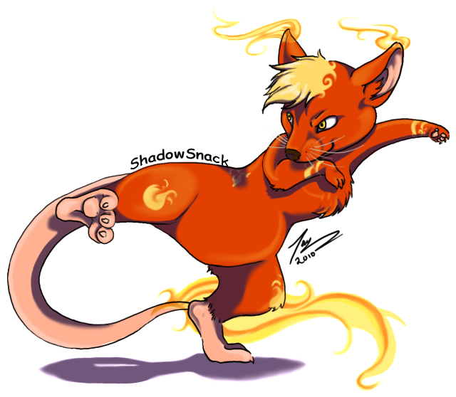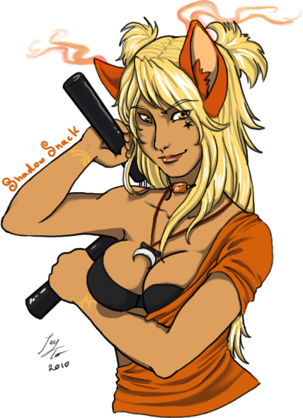 Distinguishing Features: Perky orange Wyllop ears, and Wyllop tail with flames constantly blazing from the ends. Likes to paint a little black star under her left eye. When she is experiences powerful emotions [such as rage or sadness] markings form on her body and glow as these feelings intensify. Long ragged scar that starts at her left armpit, curves around her ribcage and ends just above her belly button.