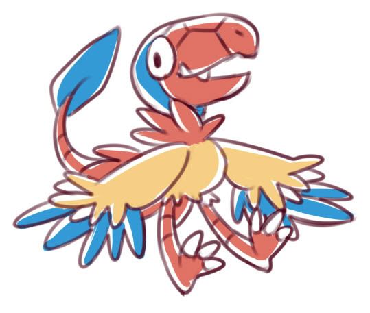 Archen is a small, bipedal creature with mixed reptilian and avian traits. Its large, red head is covered in discernible scales, and its neck has blue andIt is believed to be the ancestor of all bird Pokémon.