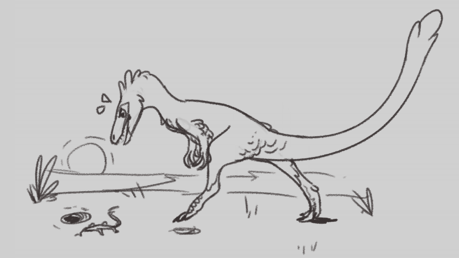As the sun rises on the arid scrubland of the Berriasian Cretaceous, many creatures awaken to begin another day of survival in an environment proving challenging at best. A chorus of pterosaurs soars above the plains, squawking their distaste for one another as they bicker over hunting and scavenging grounds. Swooping and pecking at the wings of their brethren, they attempt to establish a small territory of their own for feeding. Many feeble attempts of dominance are made in vain, as more pterosaurs flock to the racket hoping to steal an easy meal.Gazing up at this almost petty display is a small dinosaur, only about fifty centimetres tall, but with a long tail, allowing her to reach nearly two meters in length. Standing proudly on her two hind legs, she is a theropod, belonging to a large group of dinosaurs known for their hollow bones, three-toed feet and bipedal stance. Aristosuchus pusillus, or "bravest little crocodile". Ironically this dinosaur is largely avian in appearance, sporting a striking coat of short, off-white feathers with black striping. Her eyes a bright blue with flecked yellow, fixated on the squabbling fliers above, framed with a vibrant red mask of skin that signifies her maturity. She sniffs at the air, a dry, warm scent is carried on the breeze, along with something intriguing. Something edible. Losing all interest in the circling pterosaurs, her head darts to the ground, snuffling along the dusty plains in search of her breakfast.