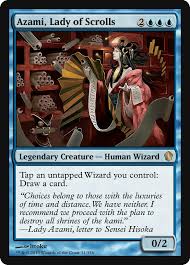 AzamiThis mono-blue deck is built around Azami, Lady of Scrolls, leveraging Wizard tribal synergies to generate massive card advantage and execute game-winning combos. The primary strategy involves deploying low-cost Wizards to fuel Azami's draw ability, controlling the board with counterspells and bounce effects, and assembling one of several instant-win conditions. Azami serves as the engine and central combo piece, enabling explosive draw turns and infinite loops with cards like Intruder Alarm. The deck operates as a draw-go control shell with high synergy, capable of winning through laboratory-maniac effects, infinite draw combos, or combat damage amplified by card-draw payoffs.